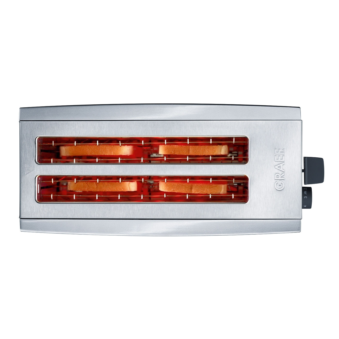 2 slots á 260 x 30 x 130 mm 4 Toasts á 110 mm Heat insulated housing, aluminium / stainless steel |