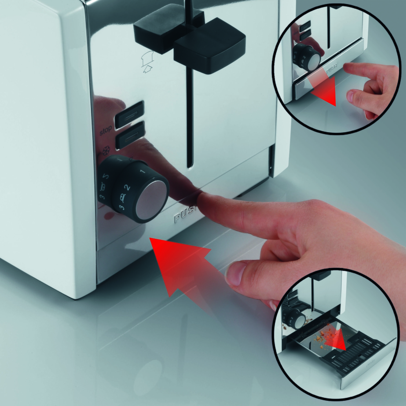 Accessoire pour petits pains Centrage des tranches de pain Dispositif de levage Enroulement du câble Krümelschublade Sicherheitsabschaltung bei Verklemmen des Röstgutes Touche d'arrêt et décongélation |