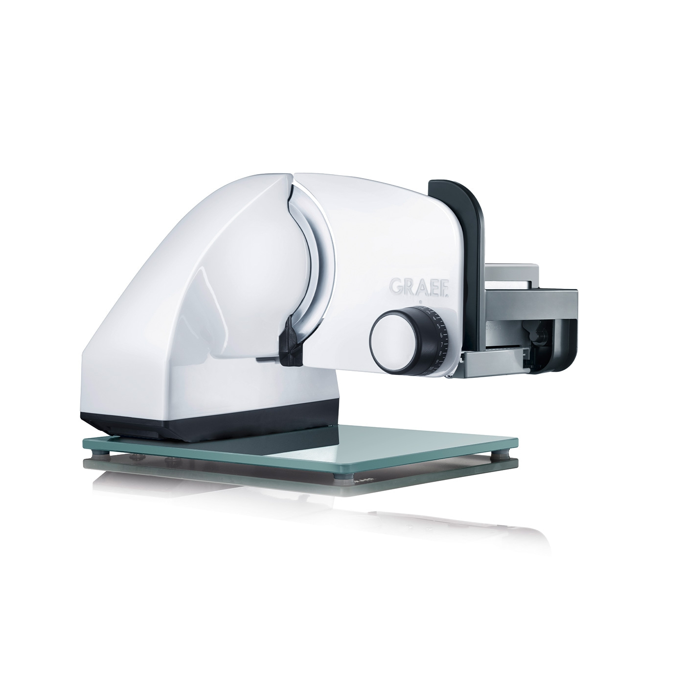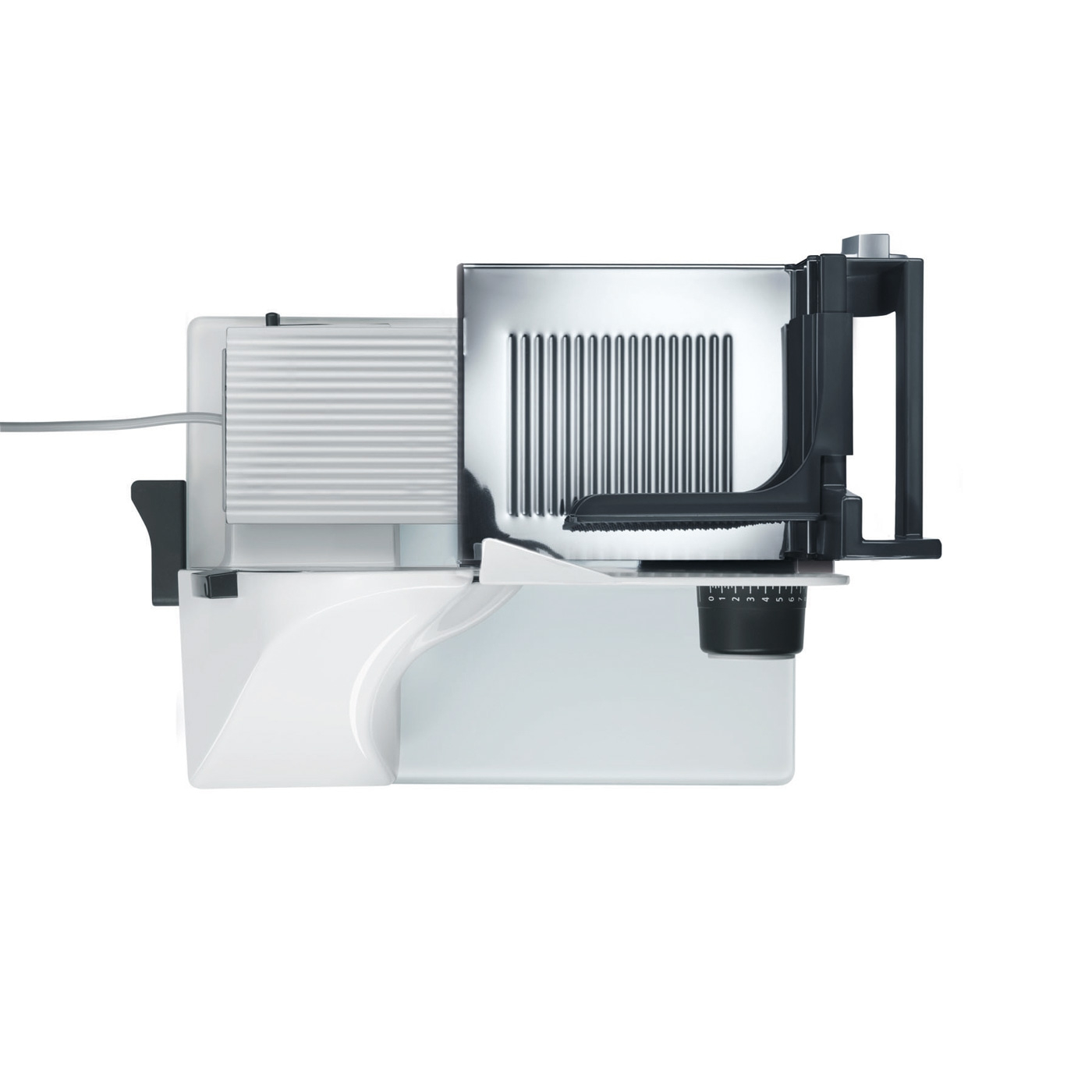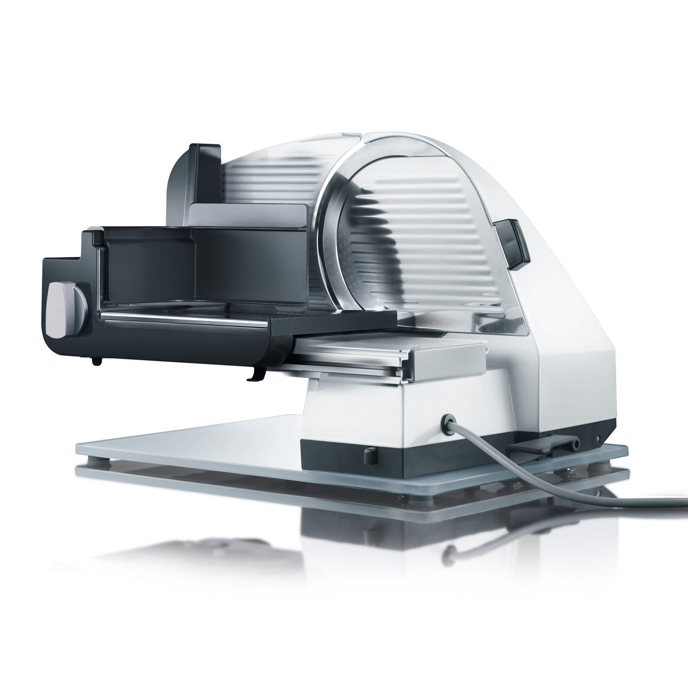 Chariot facile à manœuvrer avec support en acier inoxydable Compartiment pour les câbles Plaque de fond en verre massif et incassable Plaque de protection des couteaux amovible en acier inoxydable Réglage de l'épaisseur de tranche en continu 0–20 mm |