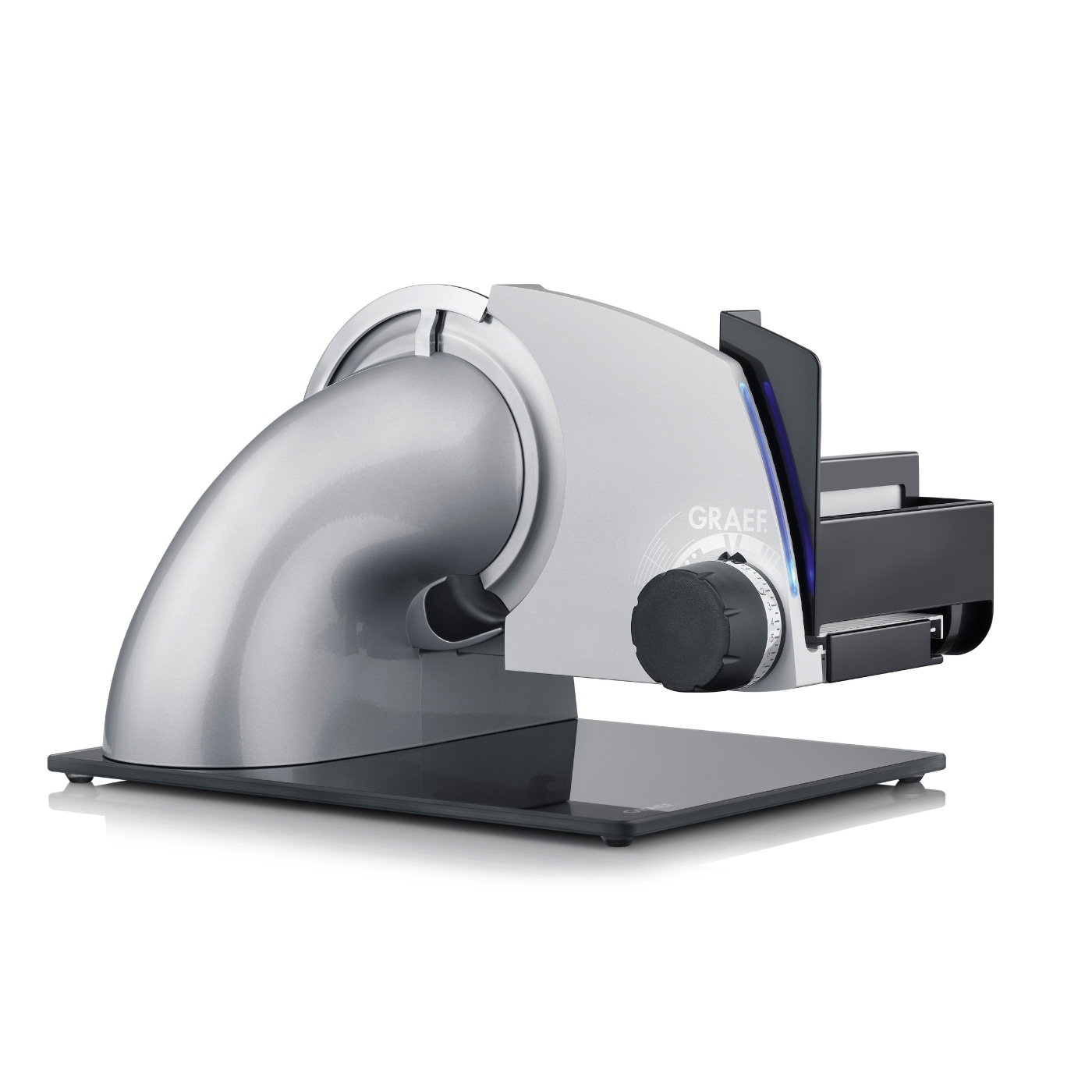 Allumez la lumière, déployez la lame et activez la puissance de coupe - la nouvelle trancheuse alimentaire SKS700 de GRAEF, rassemble 100 ans d’expérience concentrée et une multitude de fonctions inédites qui feront le bonheur des vrais fans de design et de technologie. Ainsi, le concept d’éclairage unique, jamais vu de ce beau champion du petit électroménager éclaire la cuisine de manière très élégante et avec une sécurité maximale lors de la découpe ultra précise. Au crépuscule, à l'aube, quand les yeux sont fatigués ou tout simplement si elle se trouve dans un coin sombre d dela cuisine - avec le nouvel éclairage de la trancheuse placé au niveau de l’échelle de réglage et de la zone de découpe, aucun ingrédient ne pourra plus se dissimuler ni échapper à la lame en acier massif infatigable. Particulièrement sûr et intelligent : le nouveau contrôle de sécurité à LED. Grâce à lui, le nouveau multitalents indique si l’ouverture de coupe est toujours ouverte. Car pendant que l’éclairage intégré s’allume d’abord en bleu, il passe au rouge après environ une minute - ce qui rappelle sans cesse à l'utilisateur que la lame tranchante est toujours ouverte et opérationnelle. Et ce n'est pas tout. Un réglage fin particulier dans la plage des épaisseurs de coupe de 0 à 2 mm garantit que la lame silencieuse en acier inoxydable glisse au millimètre près dans la viande, les légumes etc. Pour des résultats de coupe sans compromis !