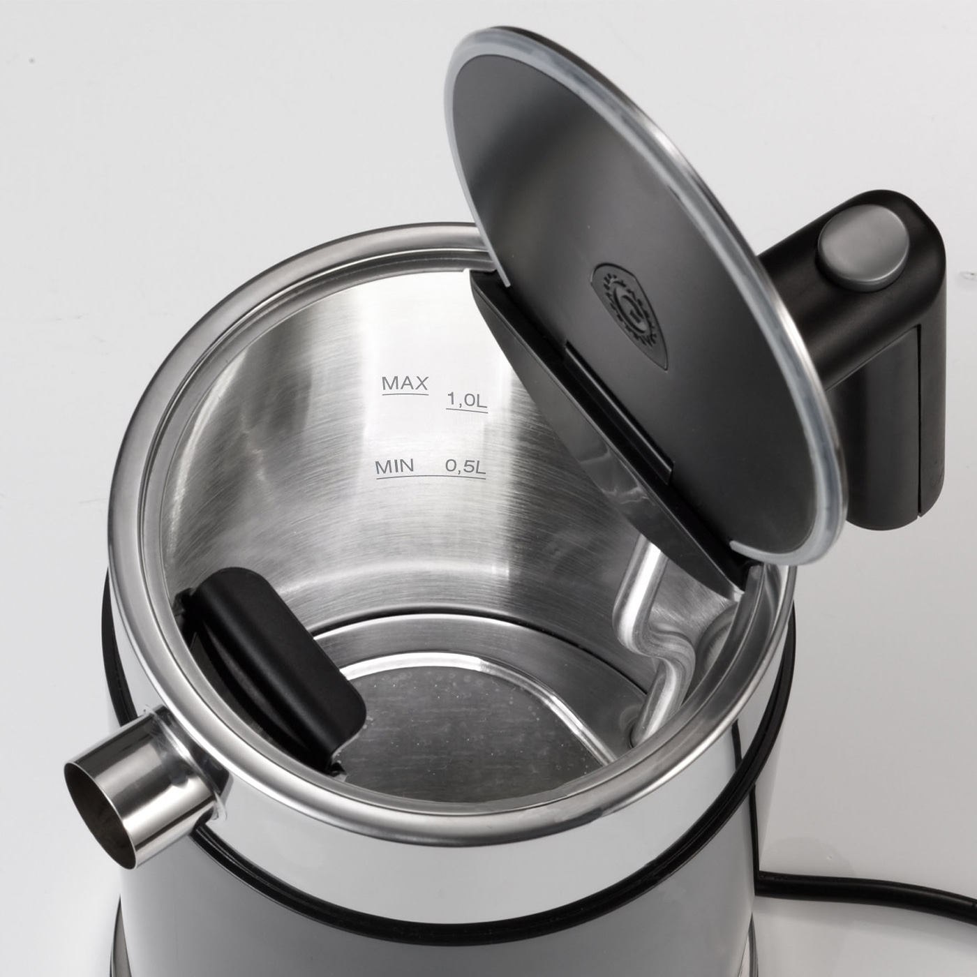 Contatto centrale a 360° Contenitori interni in acciaio inossidabile Deckel öffnet auf Tastendruck Filtro anticalcare rimovibile Interruttore On / Off Maximale Füllmenge 1,0 Liter = 8 Tassen (1 Tasse = 125 ml) Spegnimento Lift-off Spegnimento automatico |